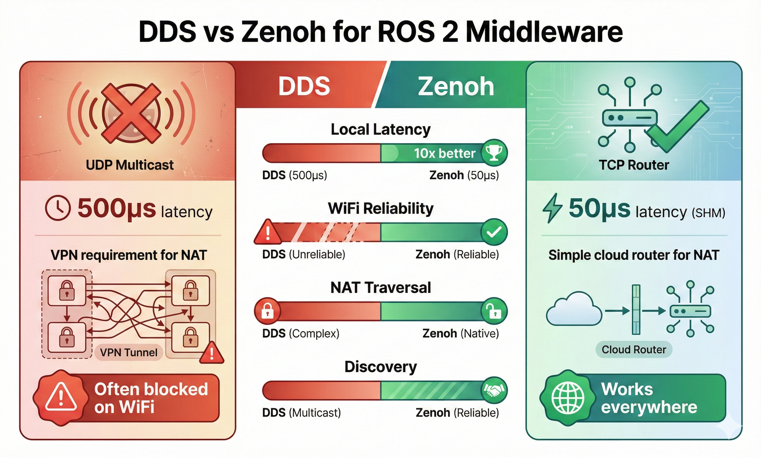 - DDS: Uses UDP multicast (often blocked on WiFi/corporate networks)