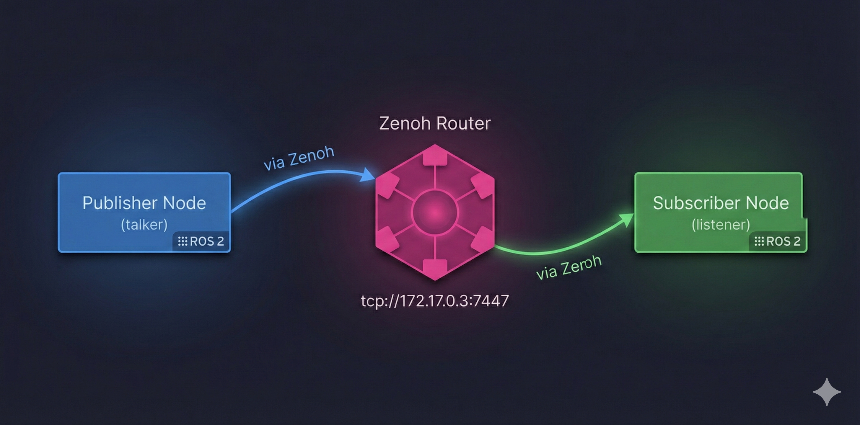 tcp://172.17.0.3:7447and provides a unique ZID (Zenoh ID) for session tracking.Automatic Connection: Both talker and listener automatically connect to the router - no manual configuration needed for same-host communication.
