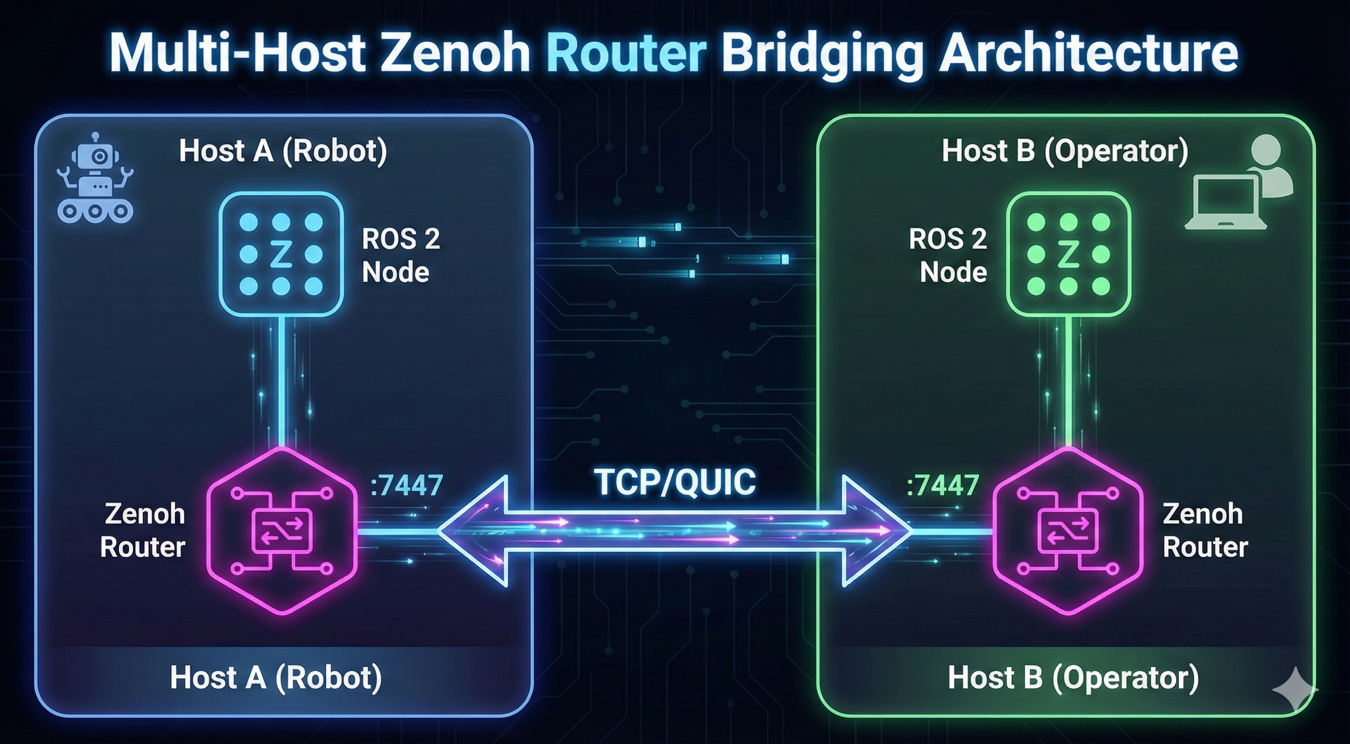 - Zenoh: Connects to central router via TCP, router manages discovery