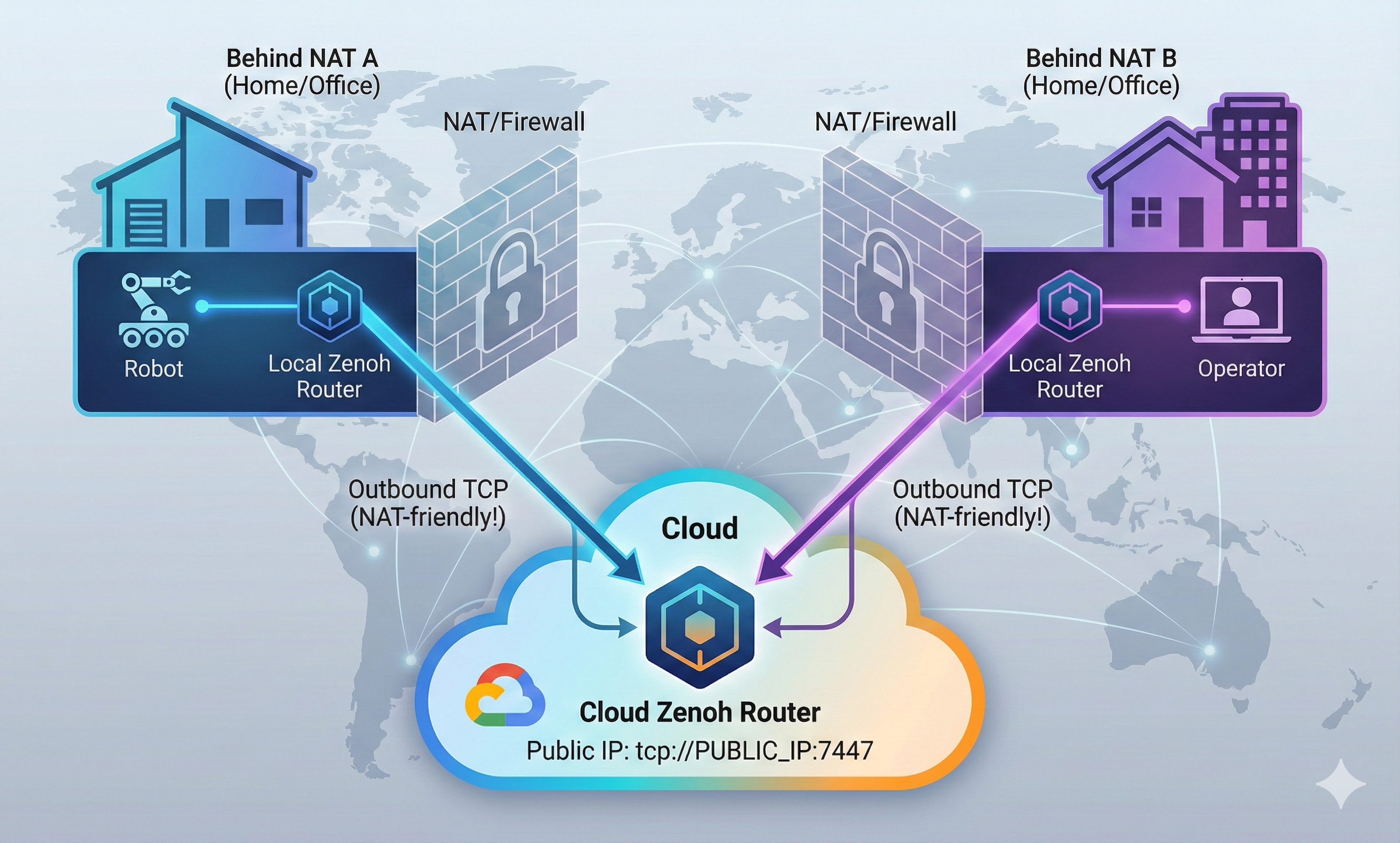 Unlike DDS which requires port forwarding or VPN, Zenoh routers can establish outbound connections to a cloud router, allowing communication across NATs.