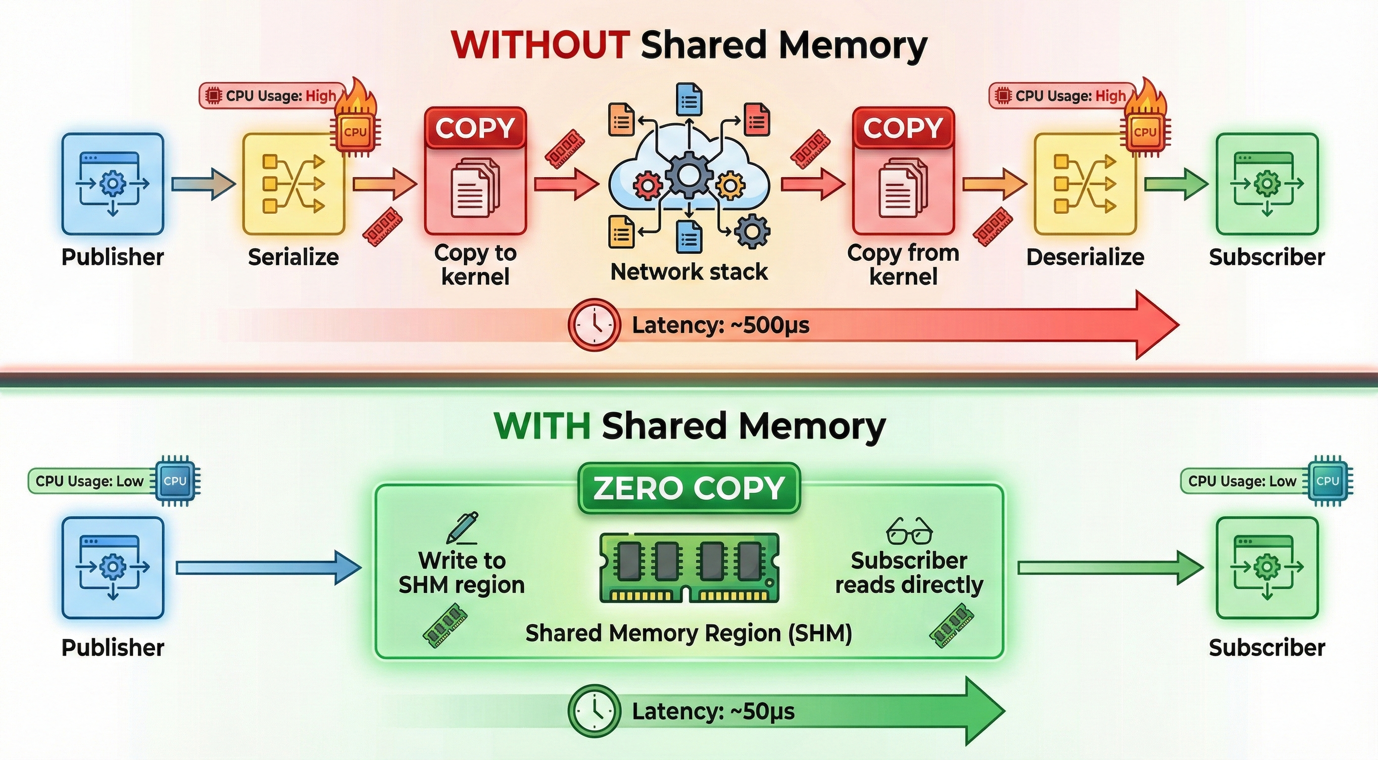 | Local latency | 500μs | 50μs (SHM) | 10x |