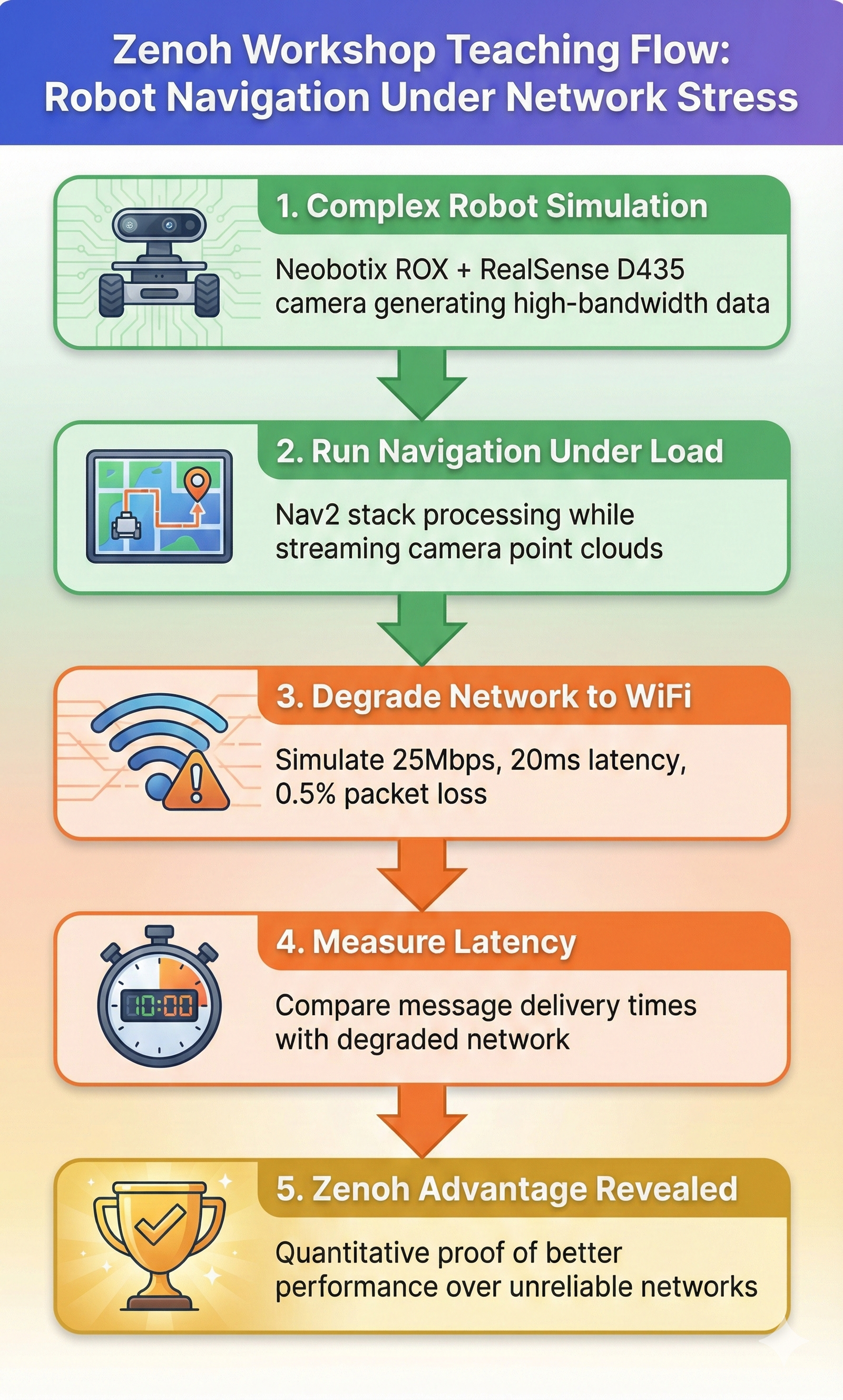 The workshop proves Zenoh’s advantages quantitatively by: