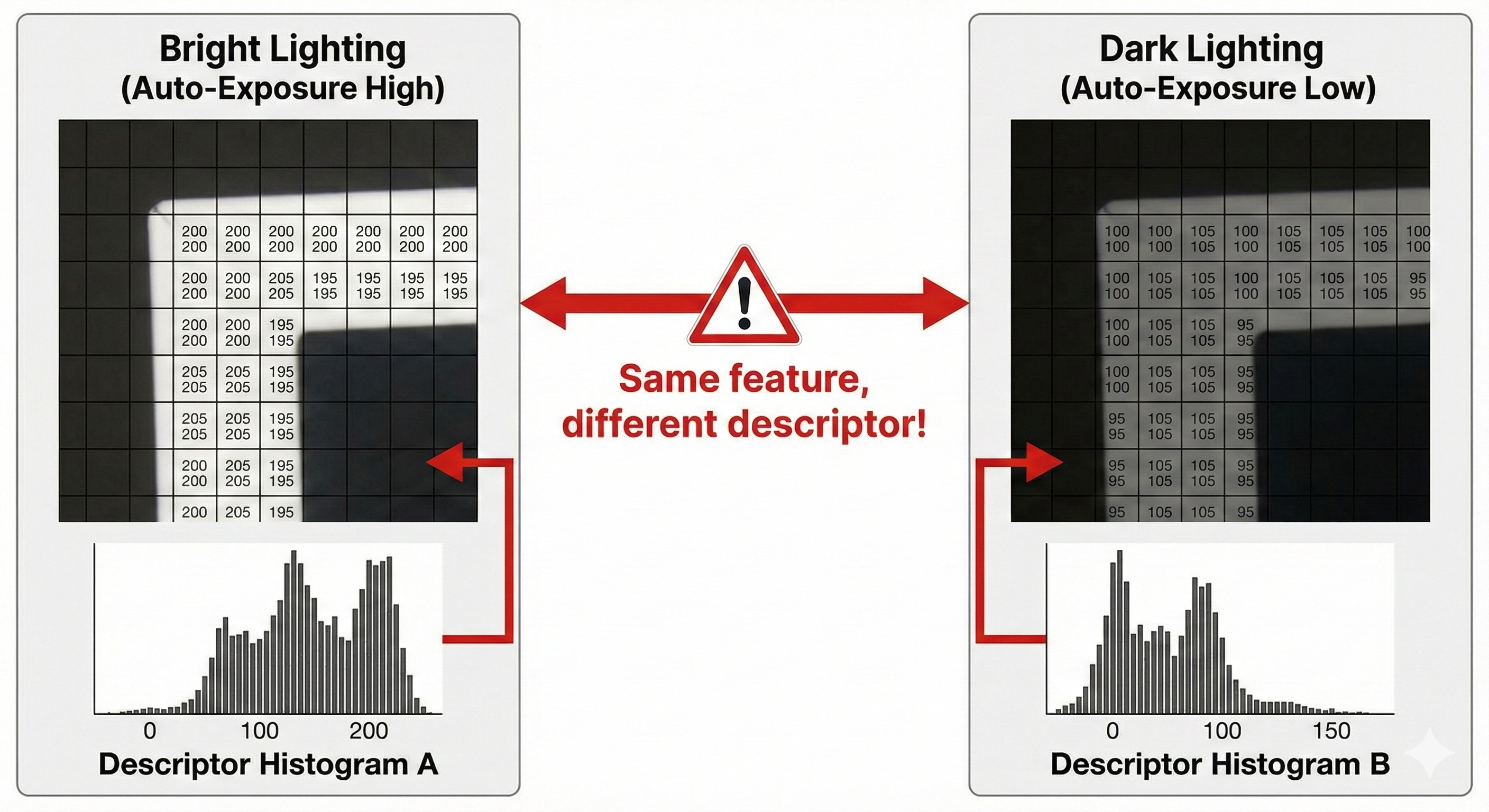 The problem: Same physical features have different pixel values after exposure change, causing descriptor mismatches!