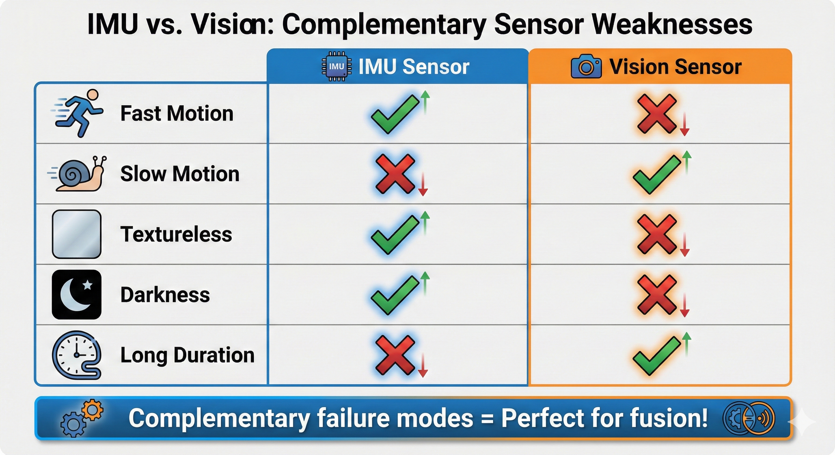 │ KEY INSIGHT: Vision and IMU have OPPOSITE failures! │
