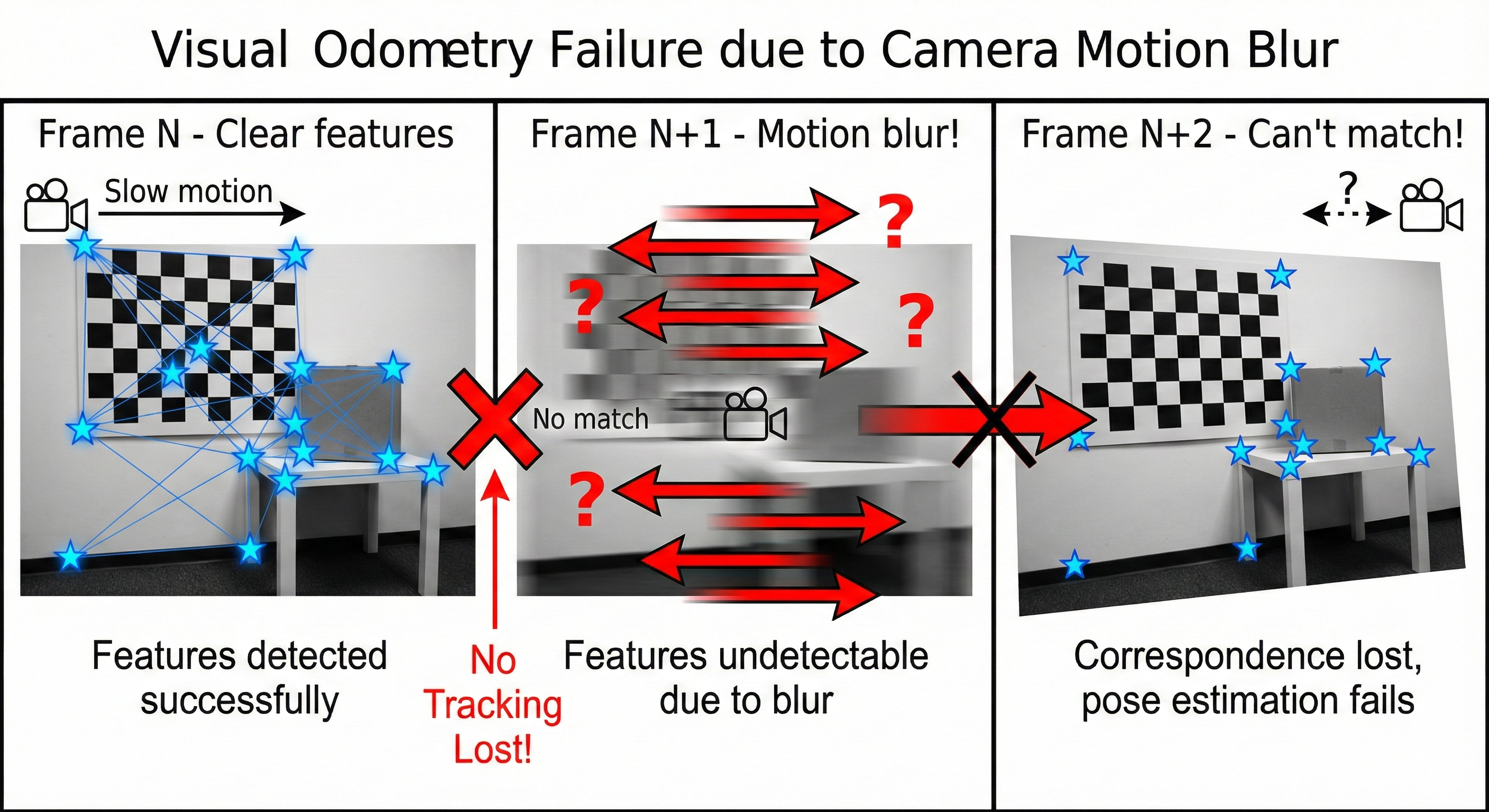 Visual odometry relies on feature matching between consecutive frames. When motion is too fast, features blur and matching fails!