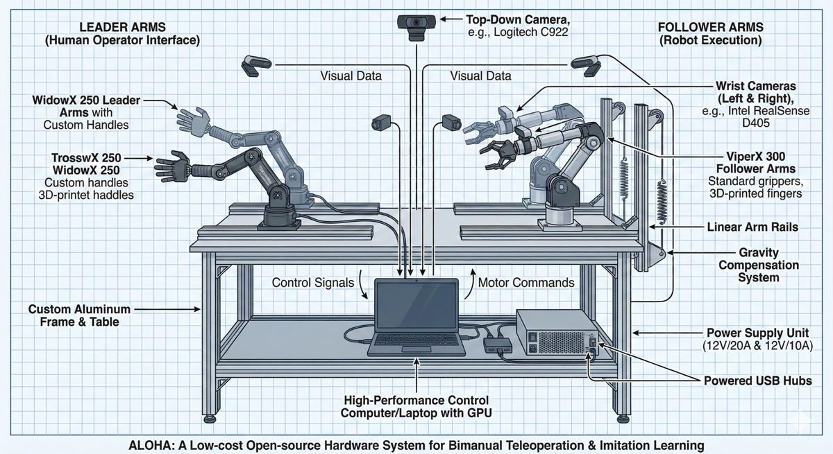 It’s an acronym: A Low-cost Open-source Hardware system for bimanual teleoperation. The name is playful, but the impact was serious. Let me show you the setup.