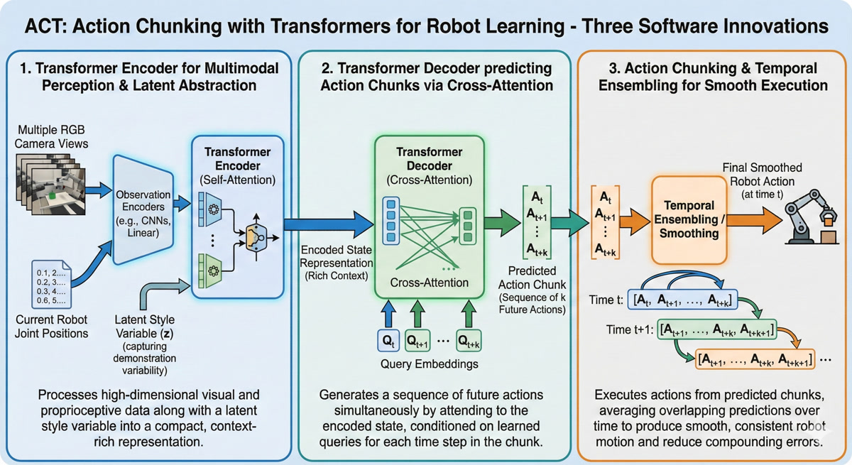 The CVAE captures the style of how to do a task. The transformer decoder fuses information from multiple cameras. And action chunking ensures the robot moves smoothly, not jerkily.