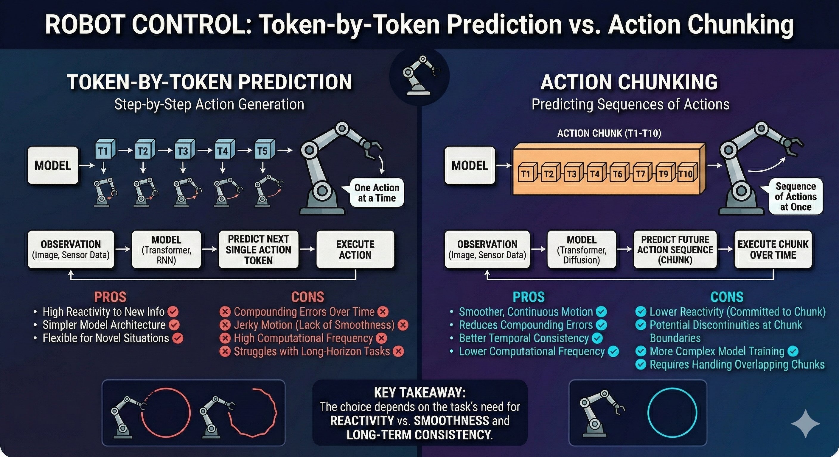 Exactly! And there’s another benefit - smoothness. When you predict one action at a time at high frequency, even small inconsistencies make the robot jittery. But a chunk of 100 actions is predicted all at once, ensuring they’re internally consistent. The motion is smooth.