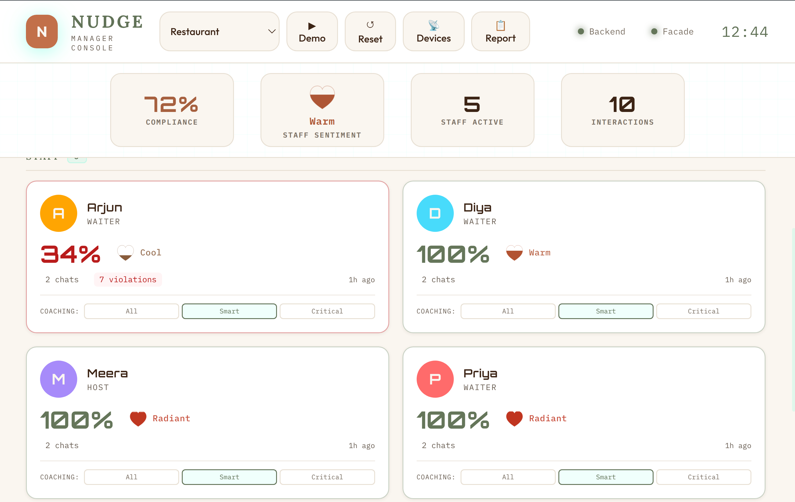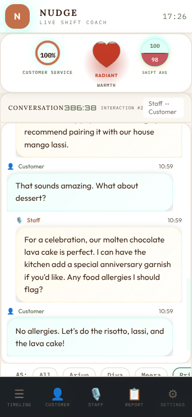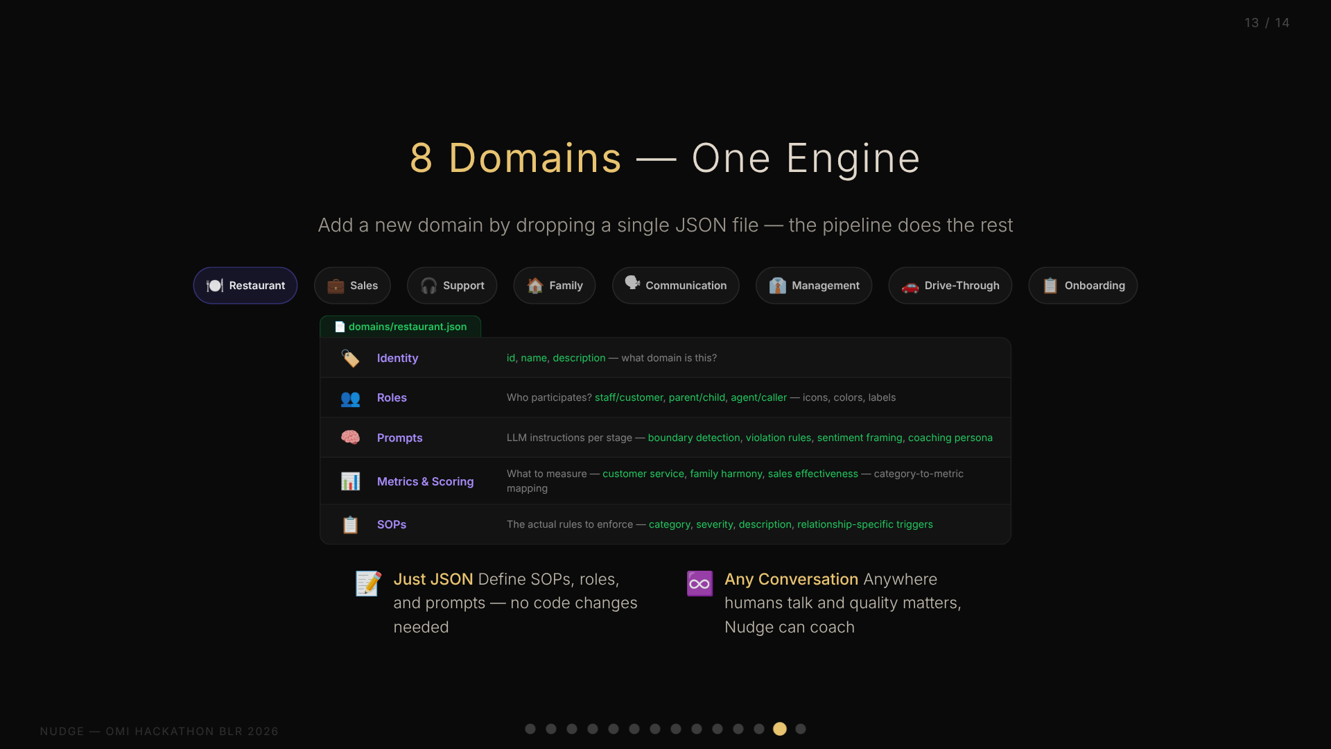 Nudge started as a restaurant SOP tool and became something broader. The domain-as-JSON architecture means it can be a family communication coach, a sales call analyzer, a customer support quality monitor, or a new employee onboarding assistant β all from the same codebase.