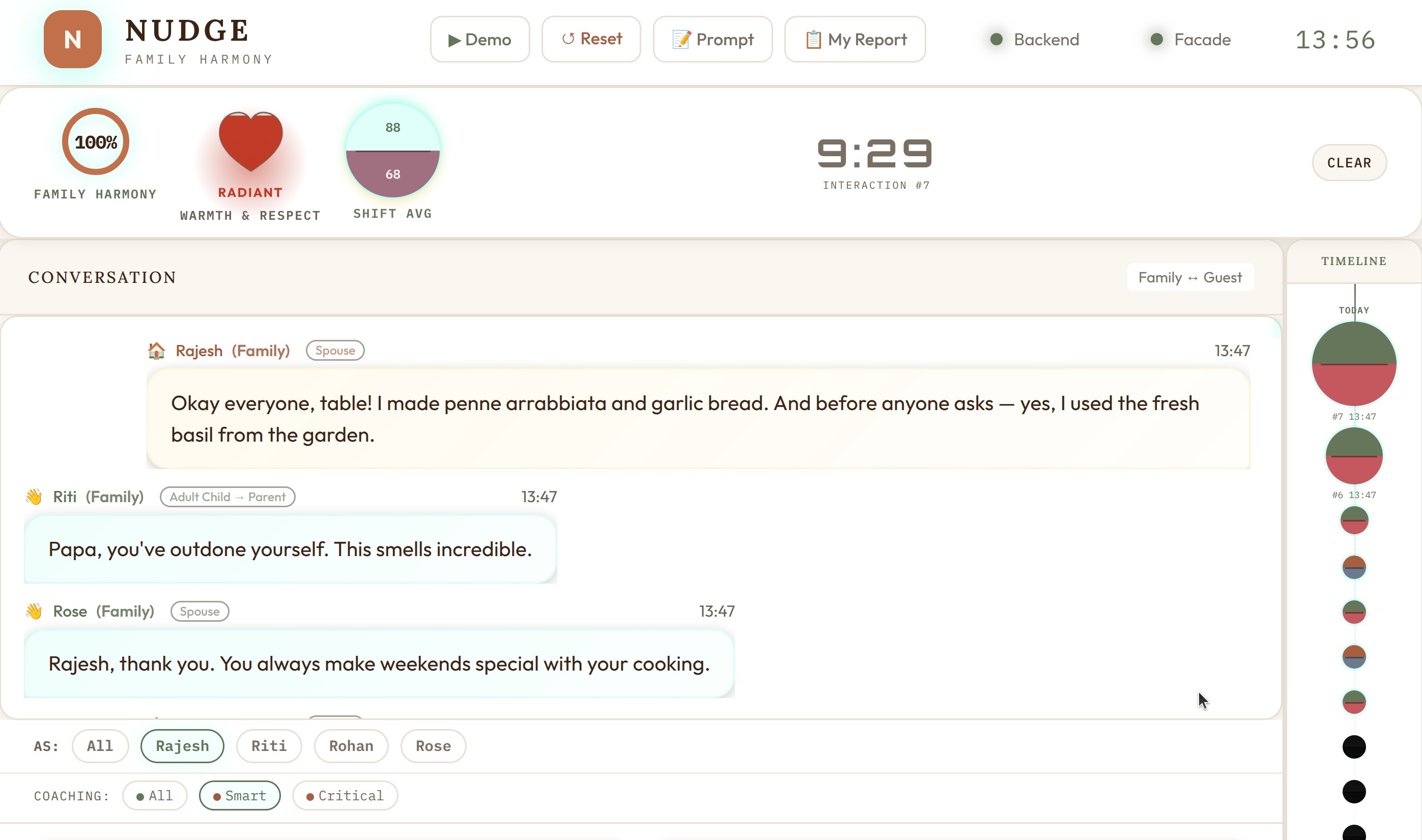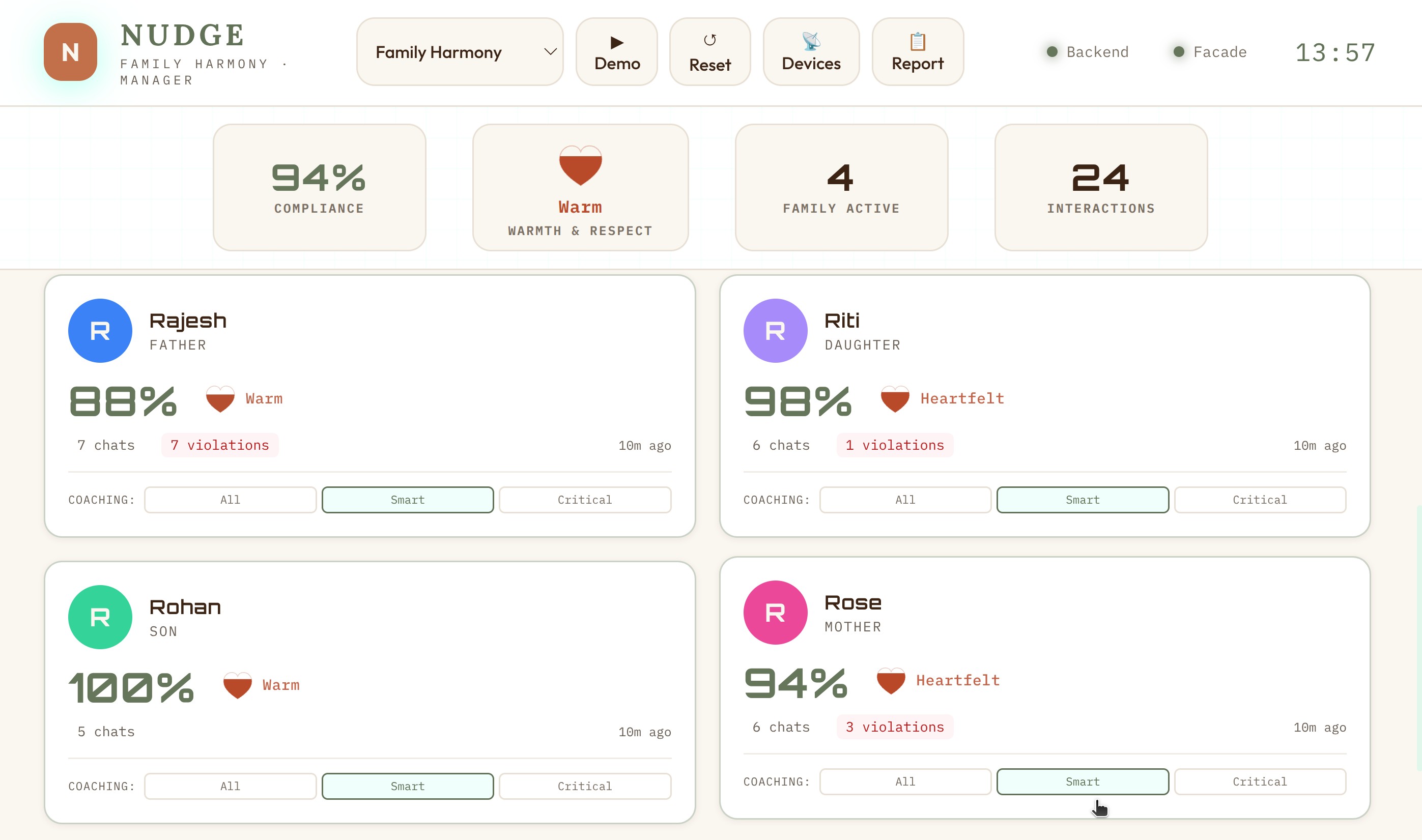 Notice how everything adapts: the role labels (Staff β Family), the metric names (Customer Service β Family Harmony), the icons, the color scheme, and most importantly β what constitutes a violation. In restaurant mode, not asking about allergies is critical. In family mode, comparing siblings is critical.