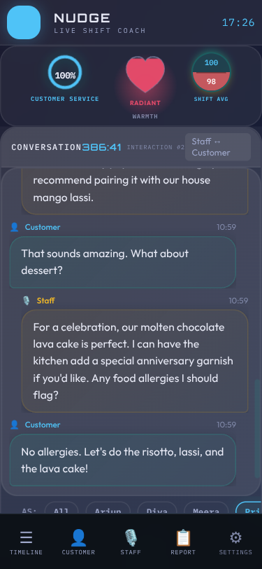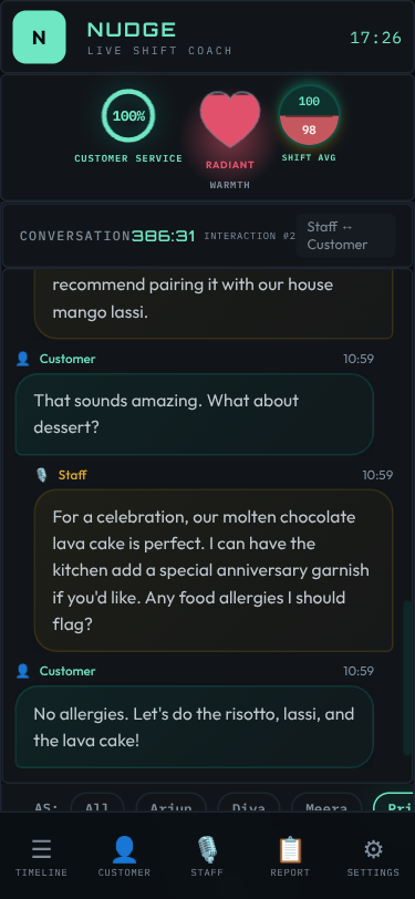 Not a surveillance tool. Not a gotcha system. An ambient coach β like having a senior mentor whispering in your ear: βHey, you forgot to ask about allergies at table 4.β